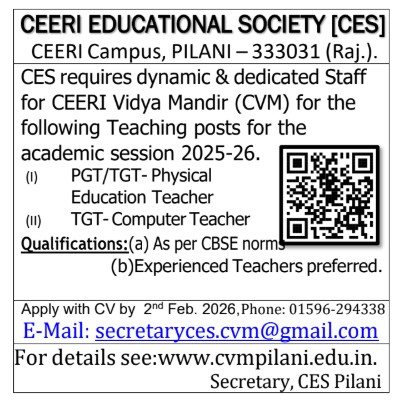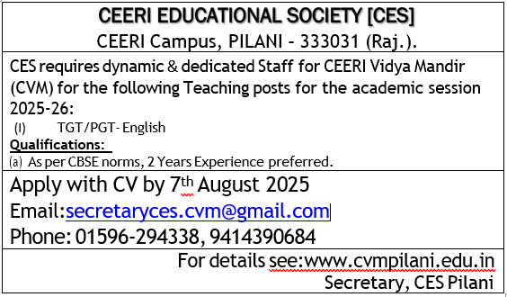 Education sets one free, going beyond words to expressions, beyond earth to sky, beyond thoughts to actions "Soar high and conquer the world" is our motto at CEERI Vidya Mandir. The foundation stone of the extension of School building was laid by the then Union Minister of Education and Social Welfare and the Vice President CSIR Dr. P.C. Chunder on 1st Oct. 1978. Beginning with a small strength, the institution gradually developed into a reputed one and today commands the strength of about 650 students. Being a Co- Educational Sr. Sec. School affiliated to CBSE, it is situated in healthy, pollution free, peaceful and idyllic campus of CEERI (Central Electronics Engineering Research Institute, Pilani)